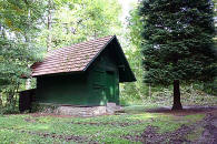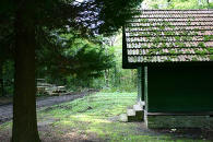 Geradeaus weiter über die Kreuzung. Nach wenigen Metern ist rechts eine Waldhütte zu sehen. |